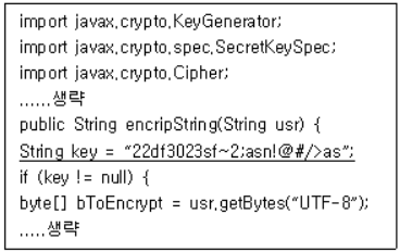 37, 다음 JAVA코드에서 밑줄로 표시된 부분에는 어떤 보안 약점이 존재하는가? (단, key는 암호화 키를 저장하는 변수이다.)