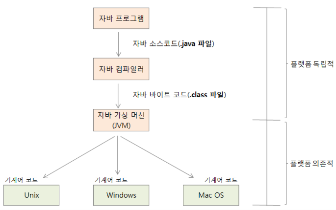 자바 소스 코드(.java)를 컴파일 하면 자바 클래스 파일(바이트코드, .class)이 생성되고, 클래스 파일은 플랫폼에 상관없이 자바 가상 머신만 있으면 실행 할 수 있다.