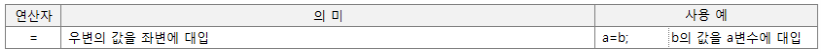 우측의 값을 좌측에 대입(assign) 한다는 의미를 갖고 있다.