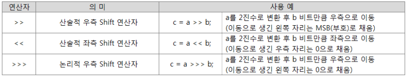 정수형 자료의 내부 비트를 좌측 또는 우측으로 이동(Shift) 시키는 이항 연산자이다.