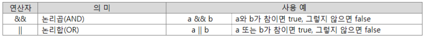 논리 연산자는 이항 연산자로 논리합(||), 논리곱(&&) 연산자가 있다.
