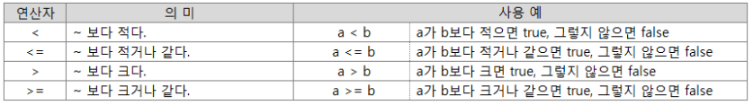 관계 연산자는 오퍼랜드(operand)가 두개인 이항 연산자로 수식을 오퍼랜드로 취하여 결과 값이 참인 경우 true를 거짓인 경우에는 false를 반환한다.