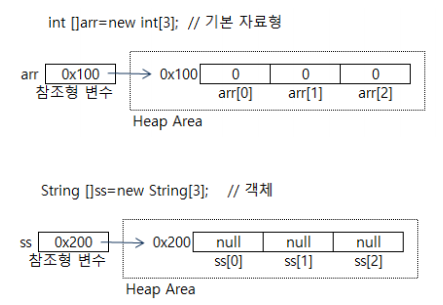- 배열의 선언은 값을 저장할 공간이 만들어지는 것이 아니라 배열의 요소를 참조할 변수(레퍼런스 변수)를 만드는 것이다.