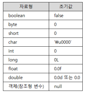 배열은 new 연산자를 이용하여 메모리를 할당한 경우 타입이 숫자형인 경우는0, 객체는 null로 초기화가 자동으로 이루어진다.